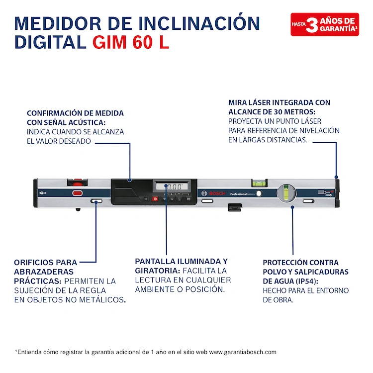 Con el GIM 60 L Professional, Bosch ofrece un inclinómetro confiable y versátil, ideal para tareas de nivelación, instalaciones y mediciones de ángulos con la máxima seguridad.