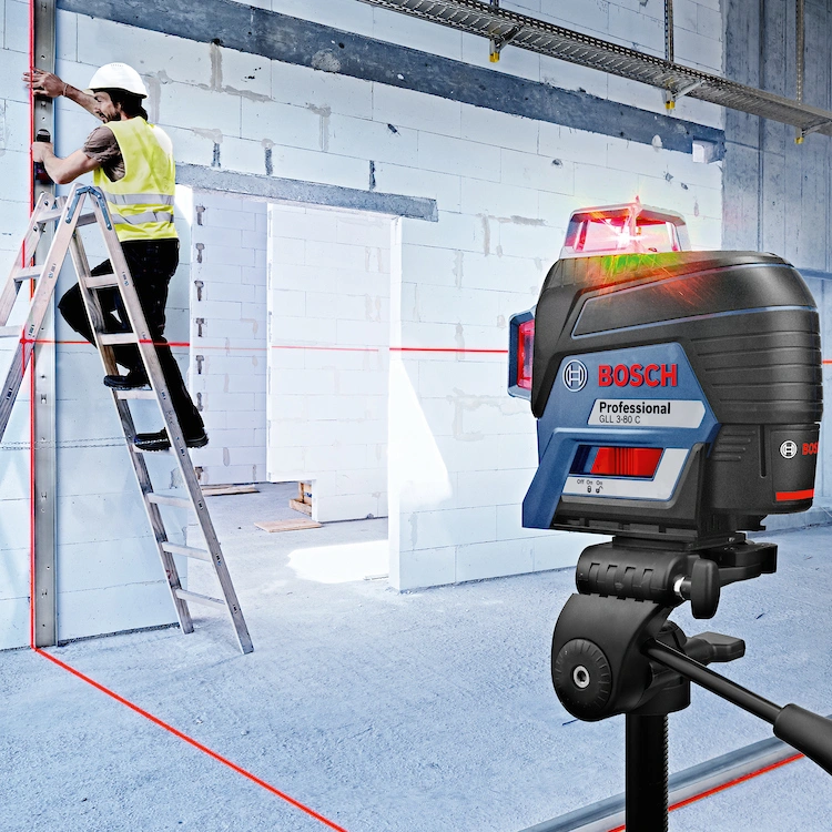 El GLL 3-80 alcanza hasta 120 m con receptor y mantiene una precisión de ±0,3 mm/m. Proyecta líneas de color rojo bien definidas, lo que mejora la visibilidad en interiores. También es compatible con los receptores láser Bosch LR 6 y LR 7.